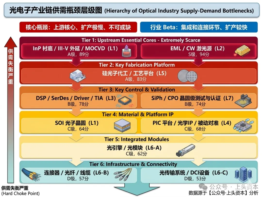 为什么是C级: 注意——这一层是收入体量最大的一层,但供需失衡程度反而最低。原因是中国厂商的工程化能力极强,扩产速度远快于上游芯片,因此竞争激烈、毛利受限。当上游EML/CW给出货指引,下游模块产能立刻匹配上去。