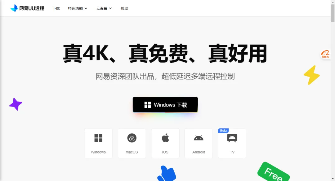 该网站清晰地传达了其产品定位:一款由网易资深团队打造,集高清画质、全面功能与完全免费于一体的远程控制工具,致力于降低用户使用门槛,提供媲美本地的远程操作体验。