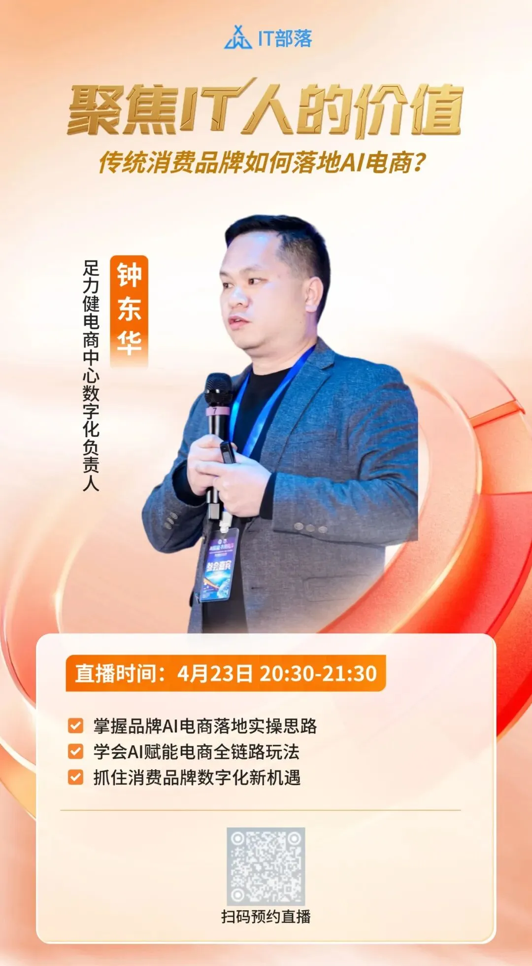 在数字化浪潮席卷传统零售业的今天,AI技术正深刻改变着电商行业的运营模式。近日,IT部落直播间特别邀请到足力健电商中心数字化负责人钟东华老师,围绕”传统消费品牌如何落地AI电商”这一核心议题,分享了足力健在AI转型过程中的组织推进、数据治理、应用落地、选型策略及团队调整等实践经验,为传统企业提供了可复制的AI转型路径。