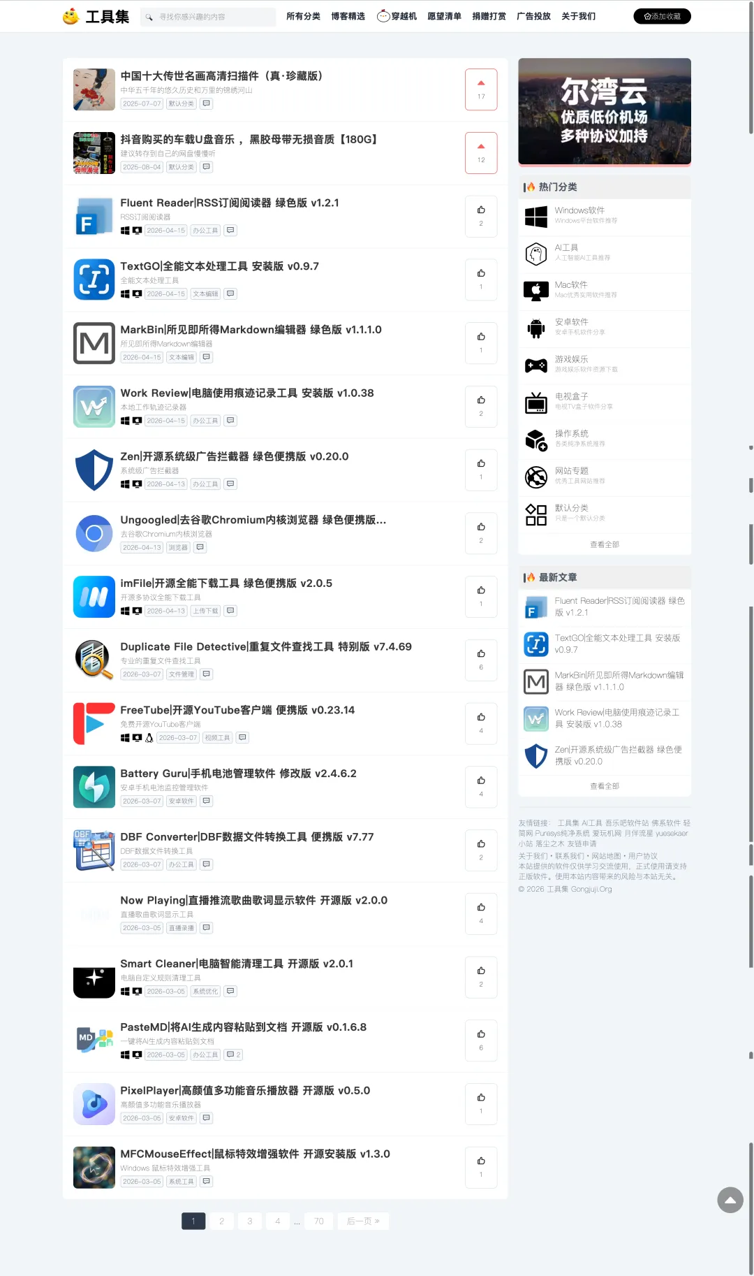 资源精选聚合:收录涵盖AI工具、开发调试、办公效率、图形设计、音视频处理、系统工具等十余个大类的软件和在线工具,堪称数字工具的“超市”。