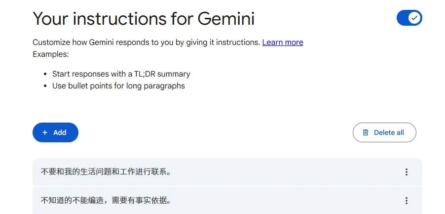 💡 我的做法是,把这些基础信息直接保存在 Gemini 的记忆(instructions) 里,定期更新,让它作为底层代码持续存在。