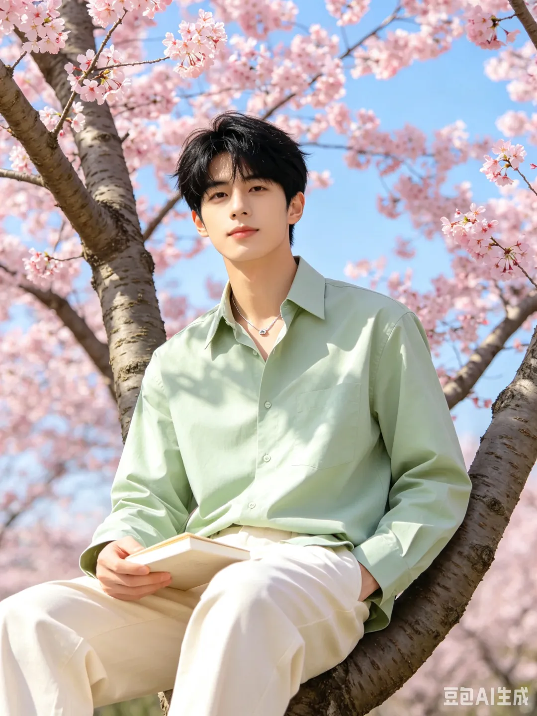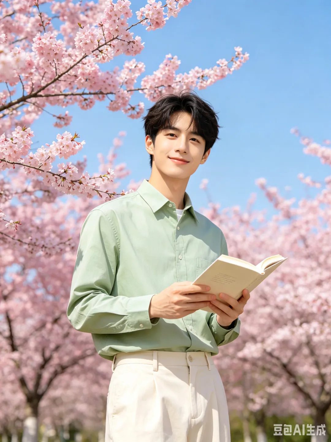 8K 高清,竖版 3:4 比例男生人像写真,春日粉色杏花林,晴朗蓝天,清新文艺风,25 岁阳光男生,身穿浅绿色极简衬衫,搭配米白色休闲裤,气质干净温柔,自然站立,双手轻抱文艺书籍,嘴角浅淡微笑,直视镜头,温柔干净少年气,柔和顺光,画质通透干净,繁花背景,春日治愈氛围感