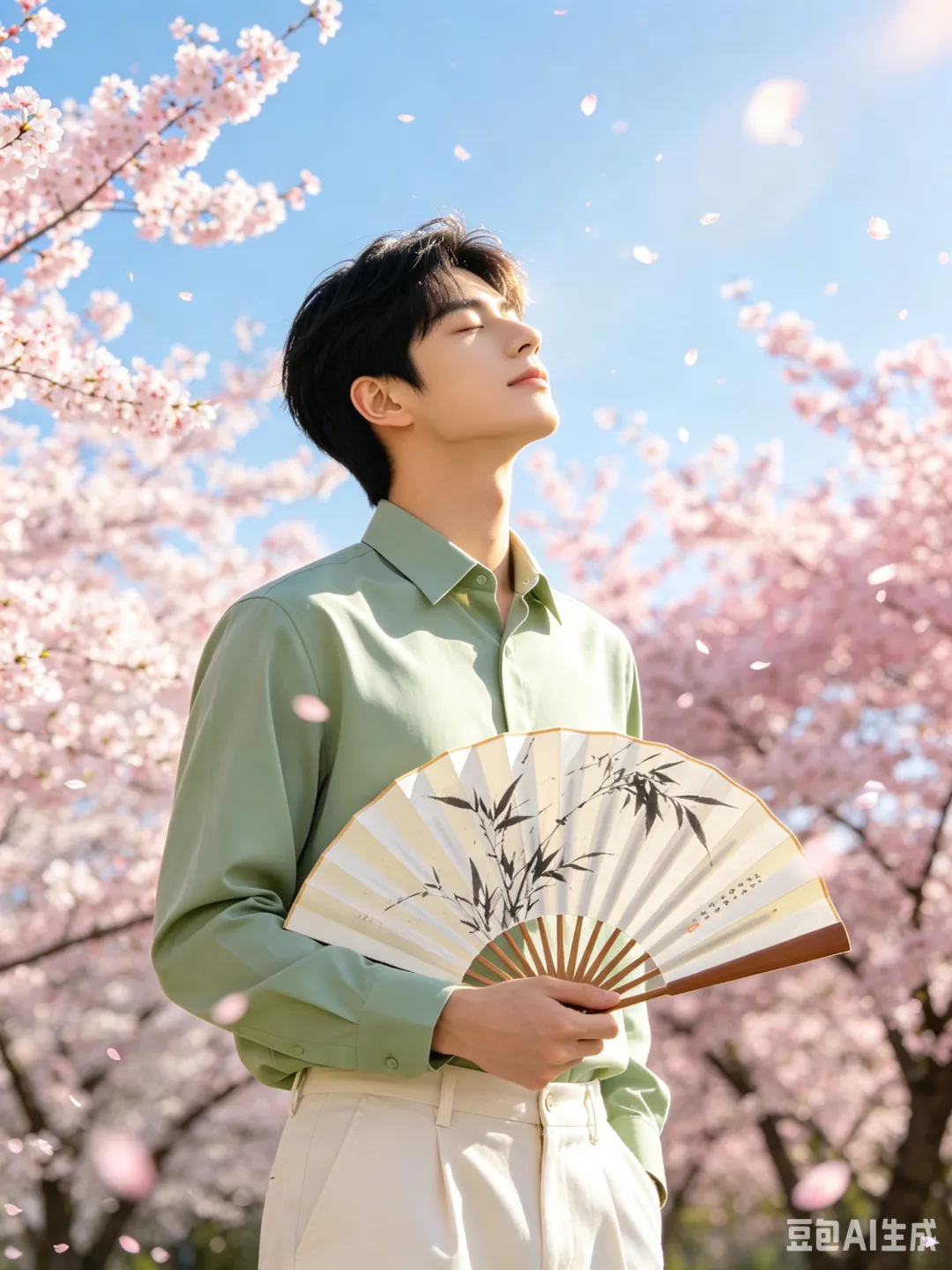 8K 高清,竖版 3:4 比例男生人像写真,春日粉色杏花林,清新蓝天,韩系简约风格,25 岁清冷男生,身穿浅绿色极简衬衫,搭配米白色休闲裤,黑发干净利落,手持水墨古风折扇,侧身站立,微微仰头闭眼感受春风,肩膀放松,被粉色杏花环绕,花瓣光斑洒落,侧逆光发丝发光,画面干净梦幻,春日文艺少年感