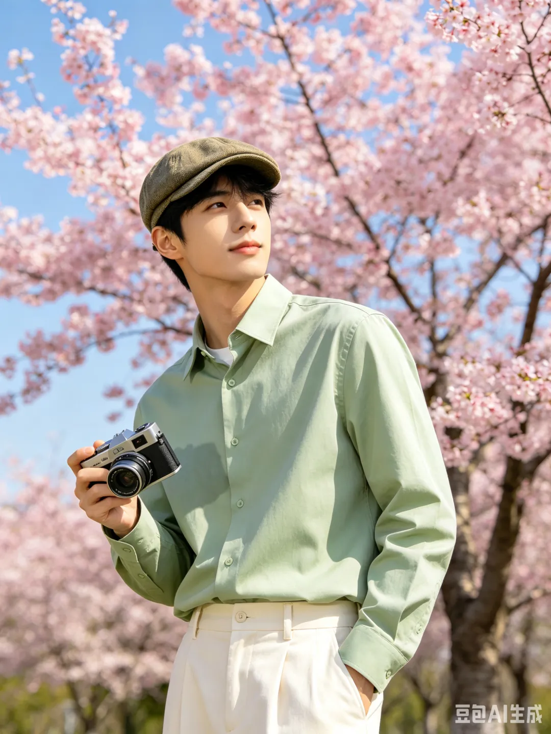 8K 高清,竖版 3:4 比例男生人像写真,春日粉色杏花林,户外蓝天场景,复古慵懒风,25 岁潮流男生,身穿浅绿色极简衬衫,搭配米白色休闲裤,手持复古胶片相机,单手举相机半挡脸颊,眼神专注看向镜头,侧身站姿,慵懒随性,侧光立体光影,背景虚化,故事感满满,春日户外写真