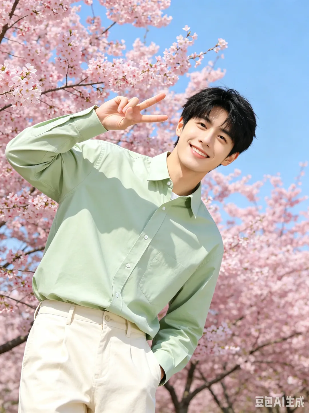 8K 高清,竖版 3:4 比例男生人像写真,春日粉色杏花林,明亮蓝天,元气少年风,25 岁清爽男生,身穿浅绿色极简衬衫,搭配米白色休闲裤,黑发清爽,站姿放松,单手抬手轻抬比耶,笑容清爽阳光,身体微微歪头,少年元气感,自然光顺光拍摄,画面明亮通透,春日活力感
