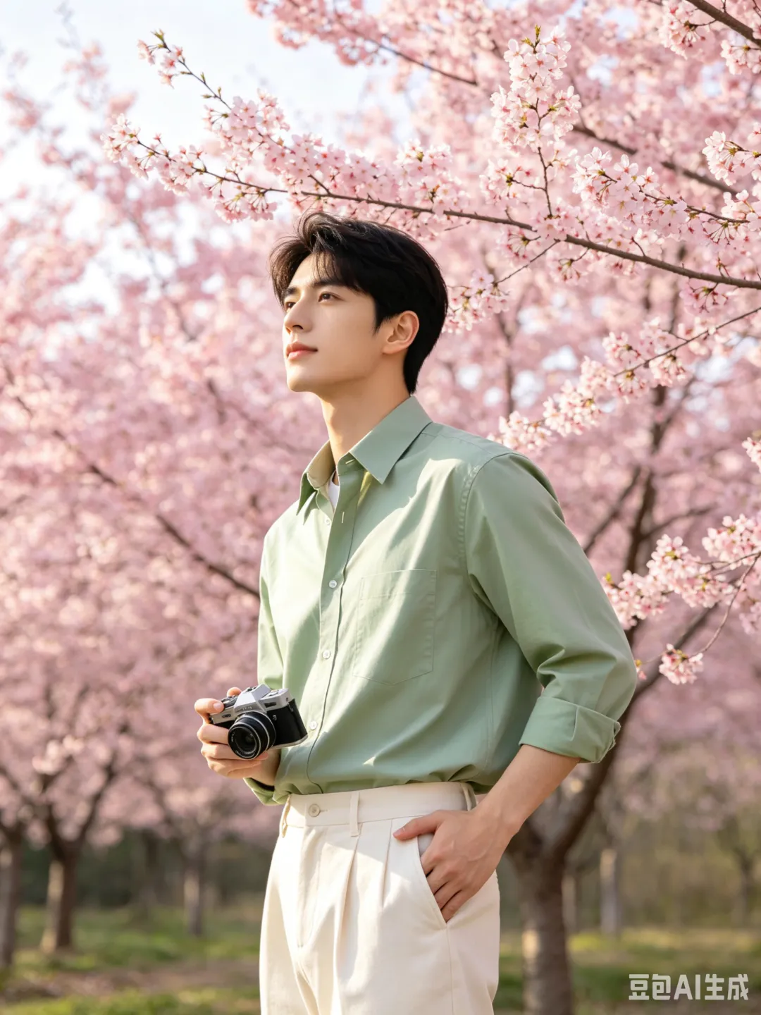8K 高清,竖版 3:4 比例男生人像写真,春日粉色杏花林,极简清新风格,25 岁轻熟男生,身穿浅绿色极简衬衫,搭配米白色休闲裤,气质清冷高级,全身侧身站立,一手轻叉腰,一手自然拿着复古相机,眼神清冷看向镜头,松弛极简风,侧逆光轮廓光,花海背景,简约高级感,胶片风