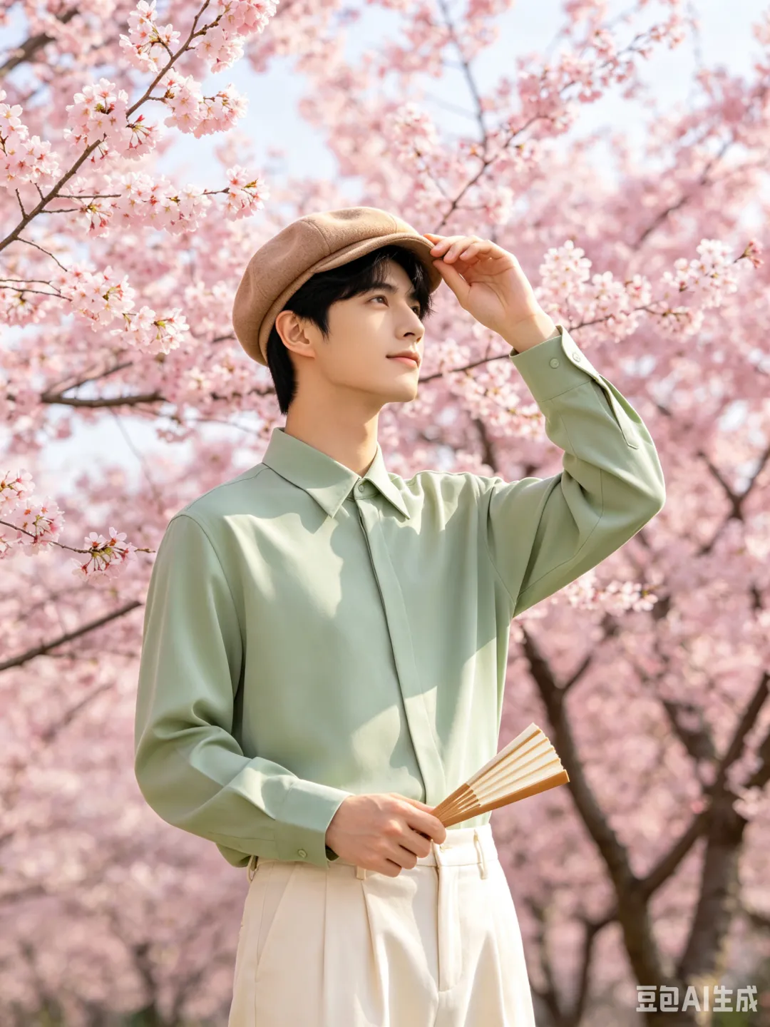 8K 高清,竖版 3:4 比例男生人像写真,春日粉色杏花林,温柔柔光场景,文艺轻熟风,25 岁气质男生,身穿浅绿色极简衬衫,搭配米白色休闲裤,头戴浅棕色贝雷帽,树下站立,单手拿折扇轻抵下颌,另一只手轻扶贝雷帽,眼神望向远方,清冷文艺感,柔和侧光,氛围温柔治愈,春日古风少年感