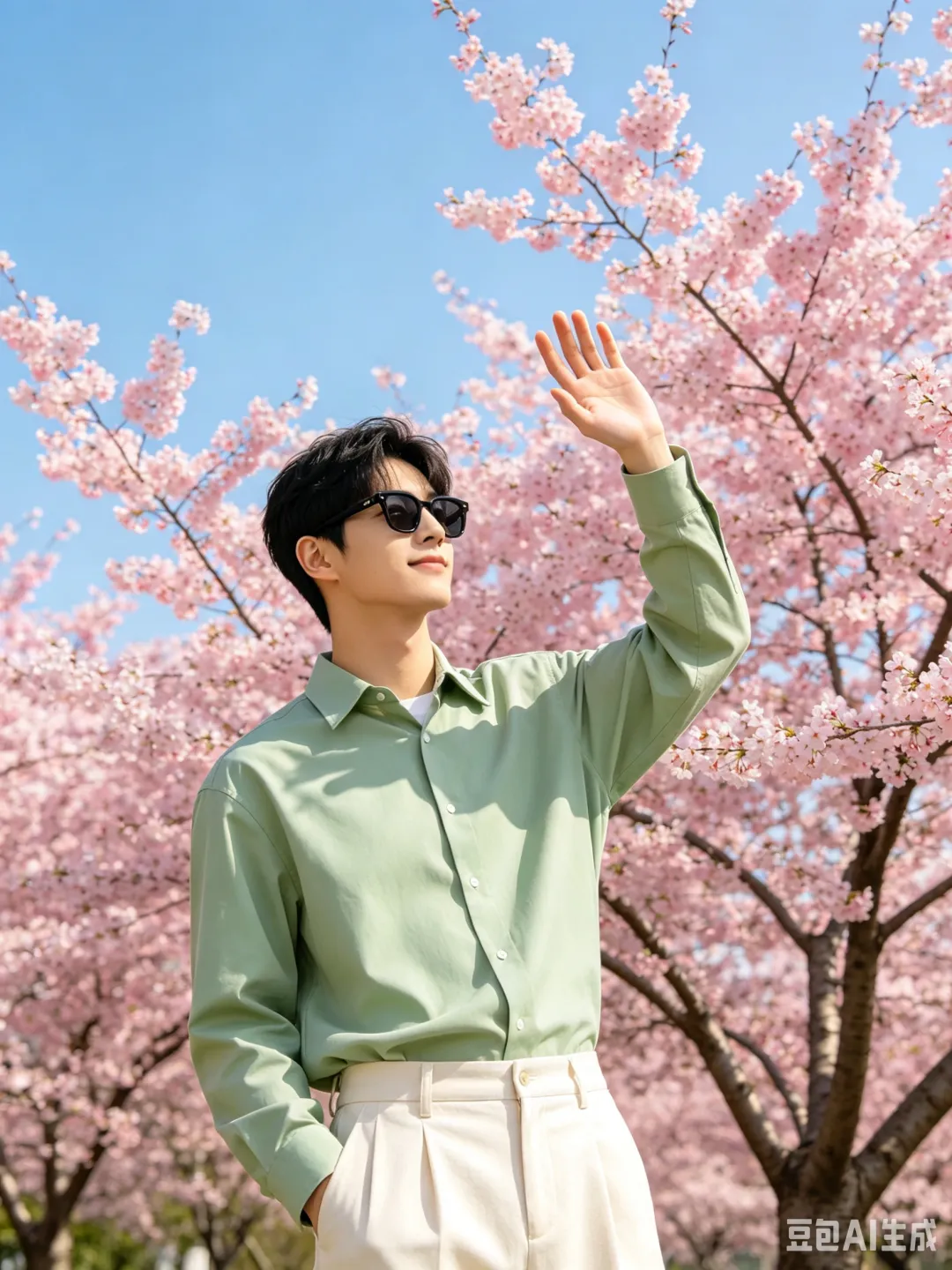 8K 高清,竖版 3:4 比例男生人像写真,春日粉色杏花林,晴朗蓝天,慵懒韩系风,25 岁潮流男生,身穿浅绿色极简衬衫,搭配米白色休闲裤,佩戴复古黑框墨镜,站姿随性,抬手轻轻挥手,氛围感松弛,慵懒街头少年感,顺光高清画质,色彩柔和,春日慵懒氛围感