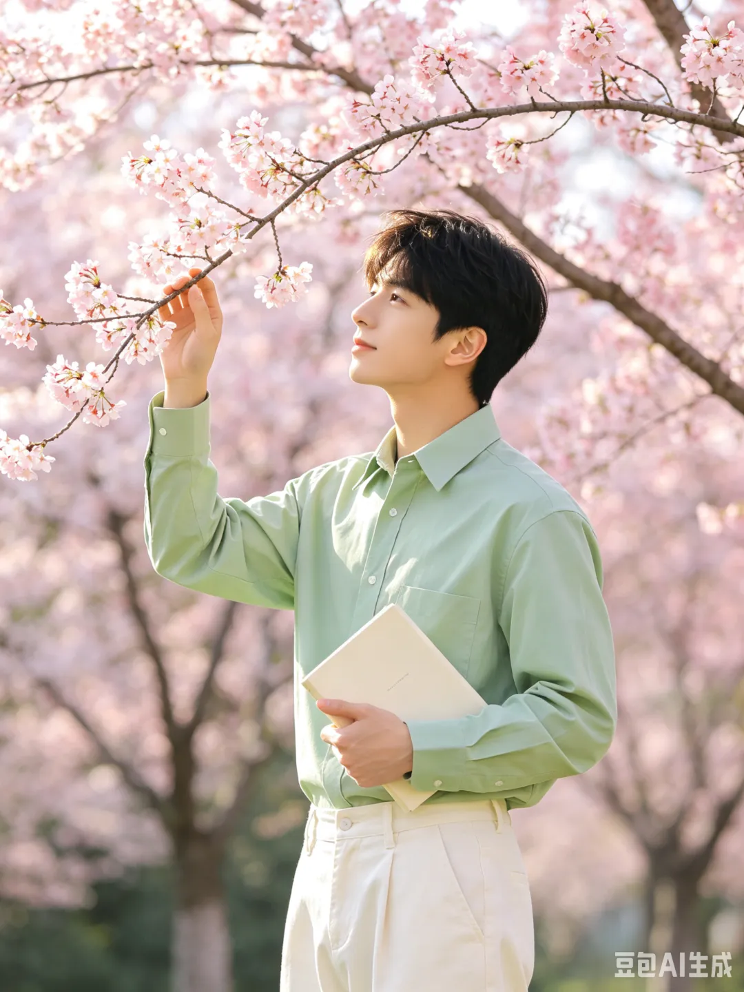 8K 高清,竖版 3:4 比例男生人像写真,春日粉色杏花林,森系清新风格,25 岁文艺男生,身穿浅绿色极简衬衫,搭配米白色休闲裤,清爽黑发,侧身轻扶粉色杏花树枝,另一只手怀抱书本,侧脸望向花海,安静文艺氛围感,背景朦胧虚化,侧逆光发丝柔光,温柔文艺,春日森系少年感