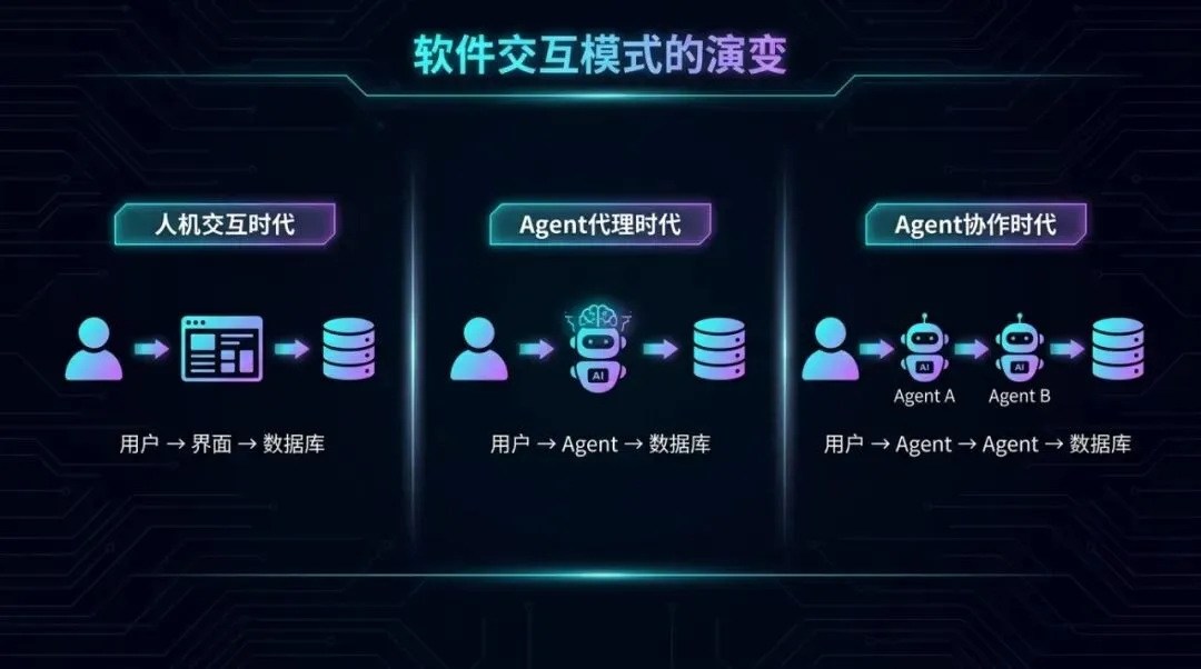用户 → 用户的 Agent → 软件的 Agent → 数据库