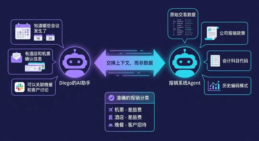 Diego 出差回来。Diego 的 AI 首席助手收到了报销系统 Agent 的提醒:他有一笔未完成的报销。两个 Agent 现在指向同一个目标:正确提交这笔报销。