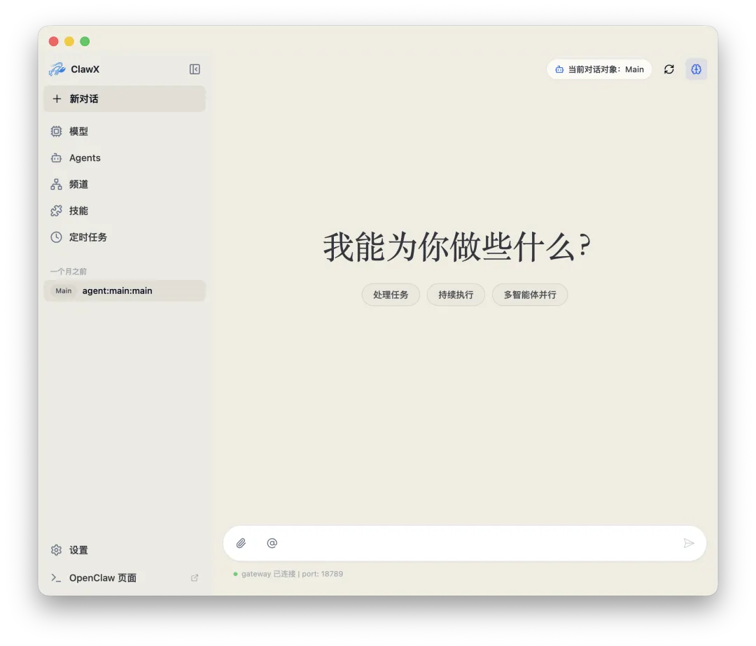如果用一句大白话介绍它:ClawX 就是给强大的 OpenClaw,做了一个简单好用的电脑桌面可视化操作界面。