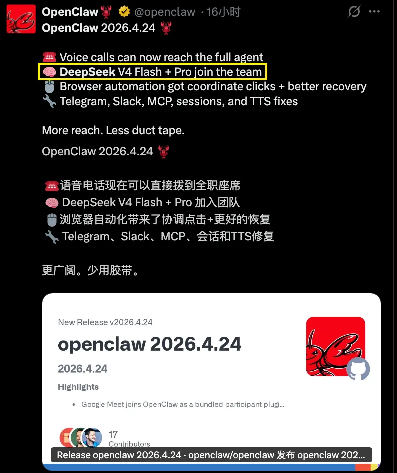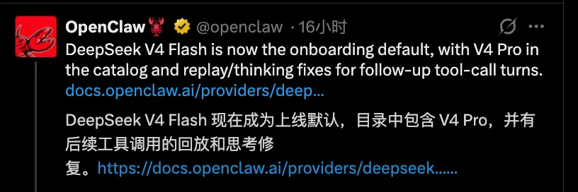 就在刚刚,全球排名第一的开源 Agent 框架 OpenClaw 正式官宣:DeepSeek v4 正式成为其系统默认模型!