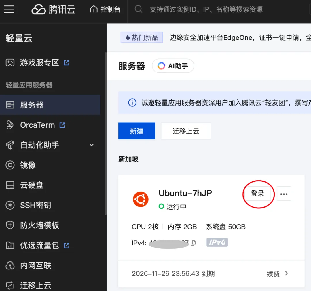 首先,我们需要一个稳定的环境来运行 OpenClaw。推荐使用腾讯云轻量应用服务器。