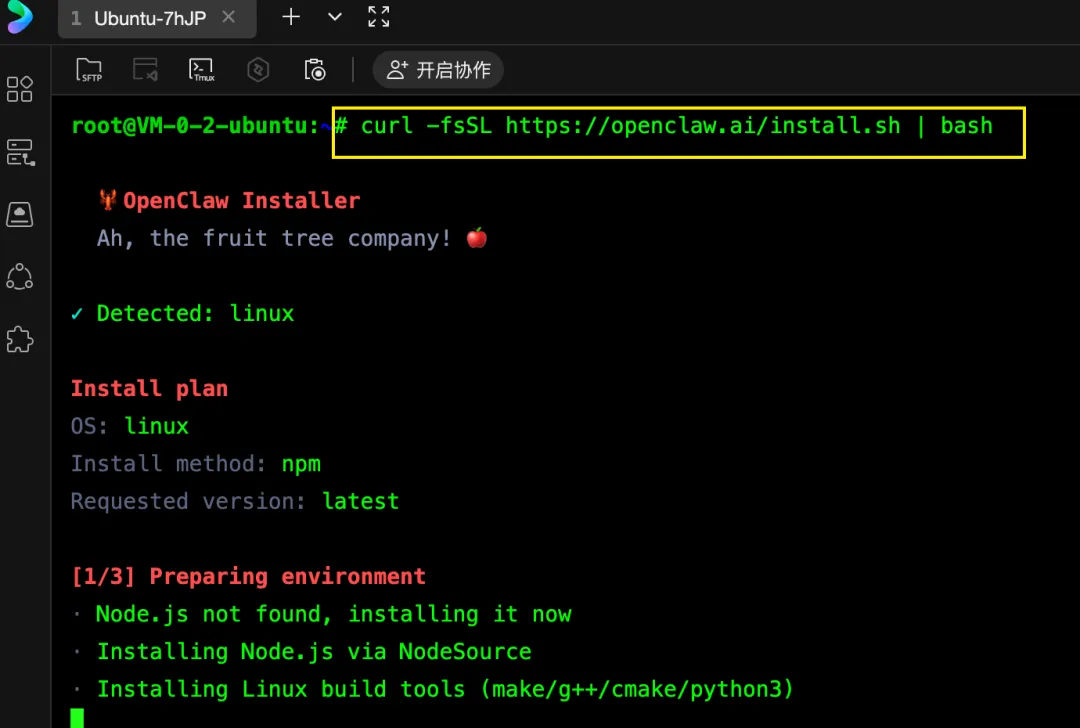 一键安装环境:通过 SSH 连接服务器,按照 OpenClaw 官方脚本进行初始化。