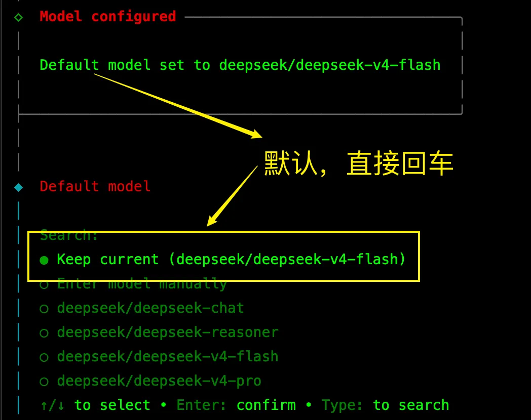 可以直接回车,下图的抬头说得很清楚,选择默认就是DeepSeek-v4 flash。