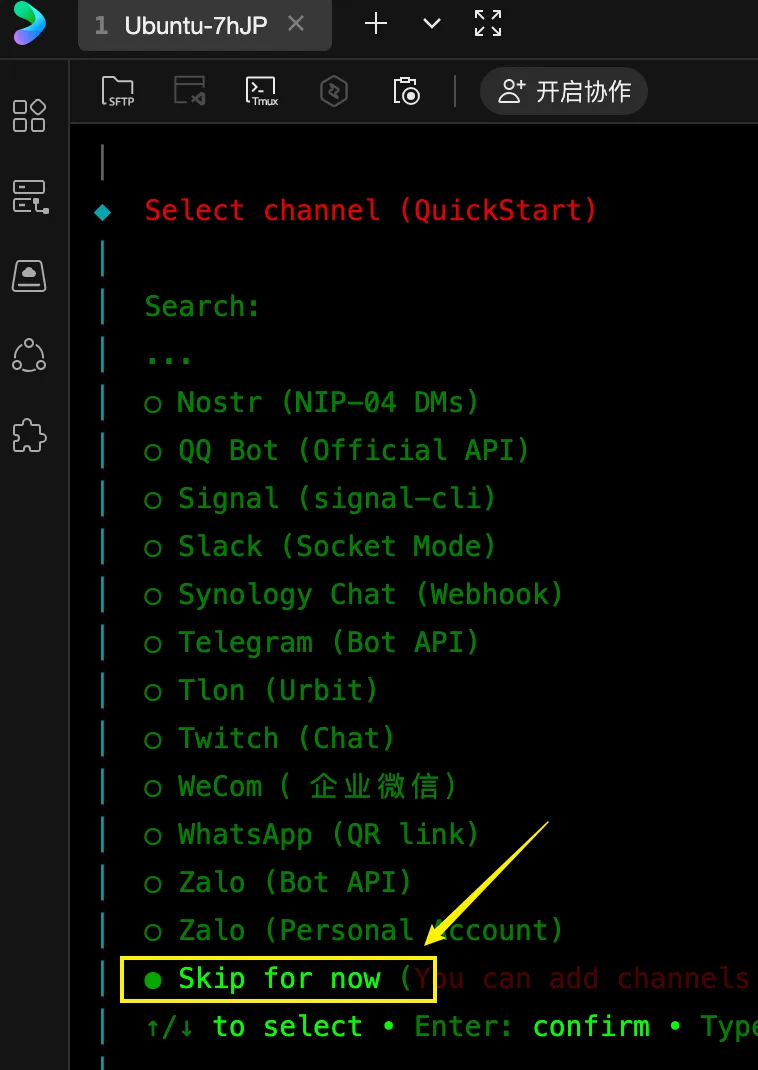 后面搜索渠道、skill 等安装,一律选 no 或者 skip,我们先把微信打通,其他后面配置都可以。