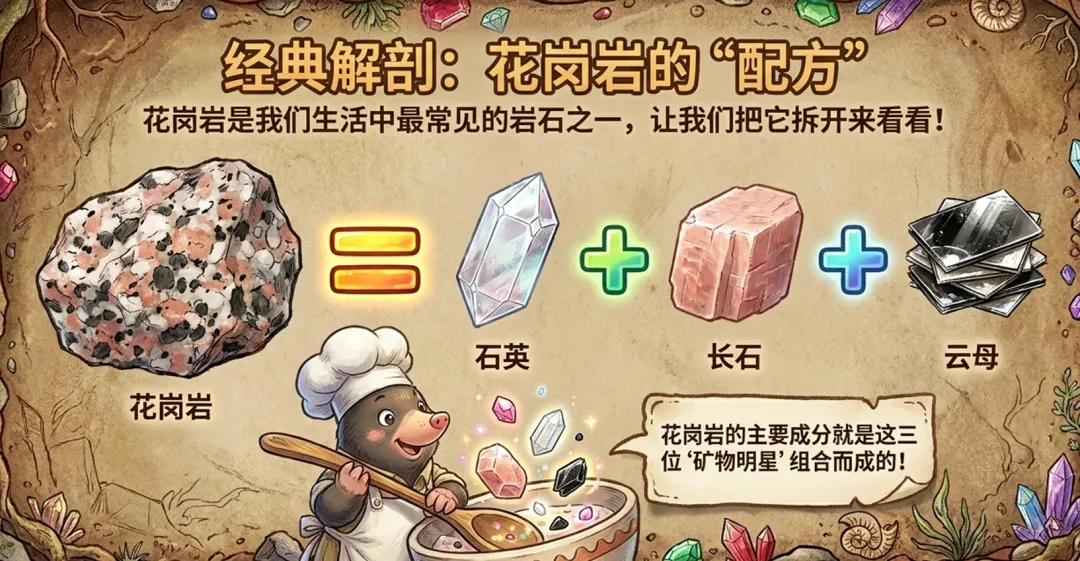 课件从岩石的组成讲起,先告诉学生一个核心概念:所有的岩石都是由矿物组成的。然后以花岗岩为例,把它拆开,用配方的方式呈现里面不同颜色的颗粒对应什么矿物。这样学生能直观理解多种矿物如何组成一块岩石。
