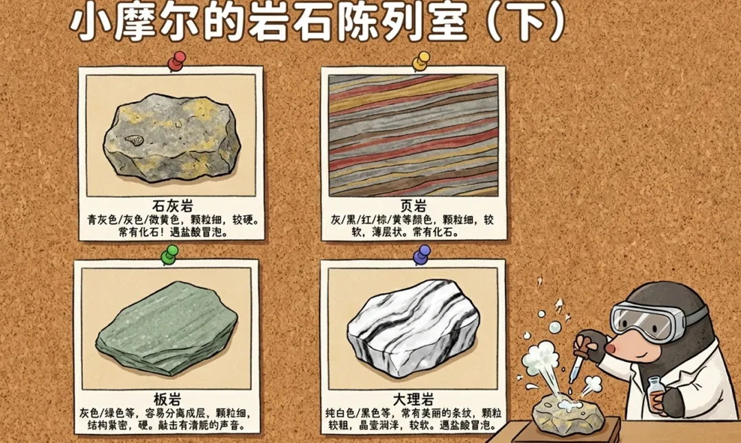 然后是小摩尔的岩石陈列室。我把花岗岩、砾岩、砂岩、石灰岩、页岩、板岩、大理岩分别用图片加关键特征的方式呈现出来了,比如砾岩看起来像混凝土,石灰岩遇盐酸冒泡,页岩是薄层状而且较软。每一张图丽都配上外观、特征、硬度的简洁描述,方便学生对比记忆。