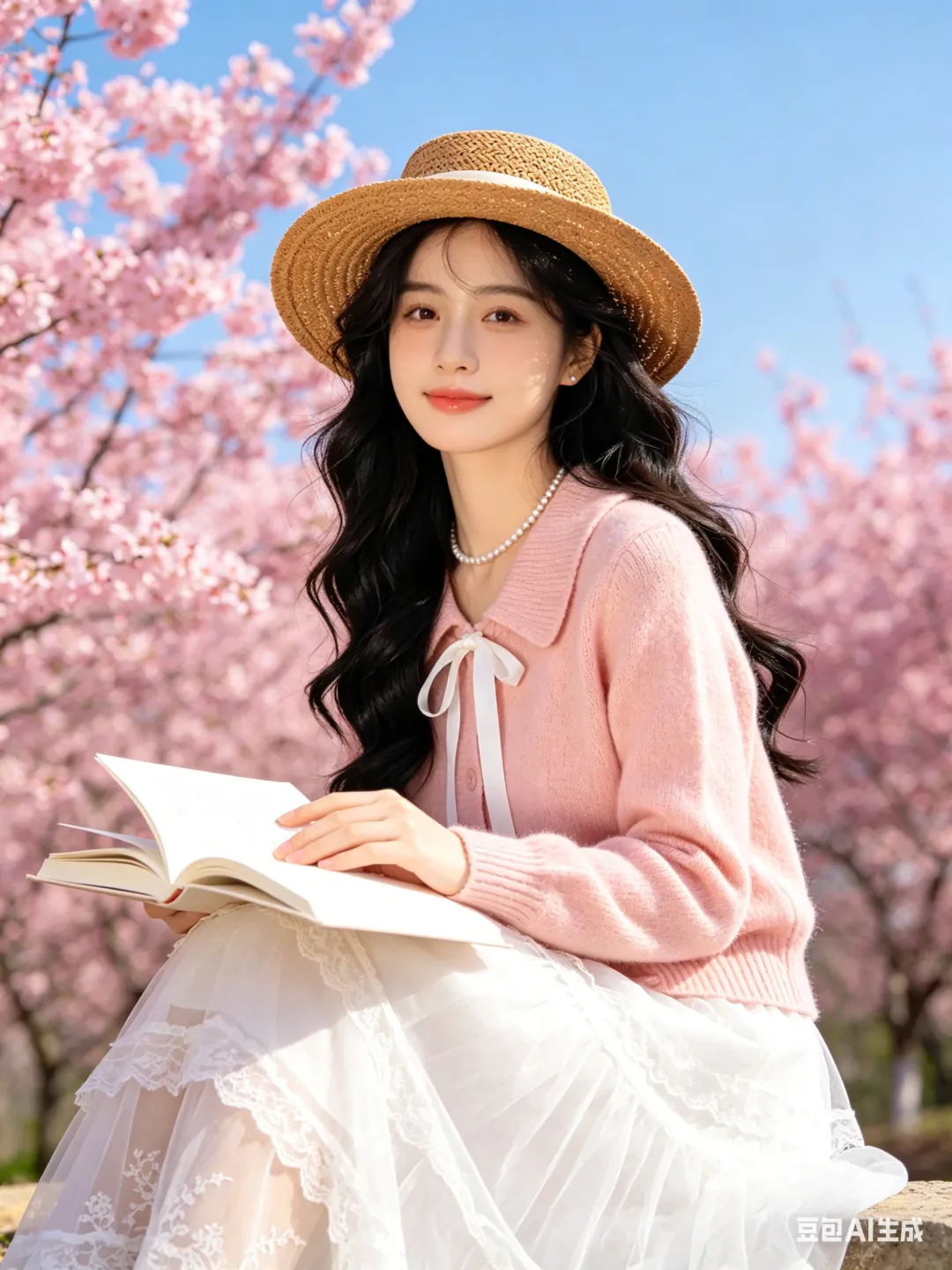 8K 高清,竖版人像写真,春日粉色杏花林,蓝天背景,清新治愈风格,一位温柔女生,穿着粉色针织翻领开衫 + 白色蕾丝纱裙,头戴浅棕色草编礼帽,黑色长卷发,胸前白色丝带,佩戴珍珠项链,正坐着,一只手轻托一本摊开的白色书本,另一只手自然搭在书页上,温柔看向镜头,背景是粉色杏花树,侧逆光勾勒发丝,画面柔和明亮,春日少女感,胶片质感。