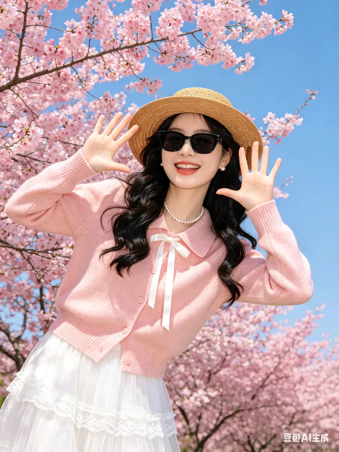 8K 高清,竖版人像写真,春日粉色杏花林,蓝天背景,清新治愈风格,一位元气女生,穿着粉色针织翻领开衫 + 白色蕾丝纱裙,头戴浅棕色草编礼帽 + 黑色墨镜,黑色长卷发,胸前白色丝带,佩戴珍珠项链,双手抬起张开五指,在阳光下比耶,笑容灿烂,背景是蓝天和杏花,顺光拍摄,画面明亮活泼,春日元气少女感。