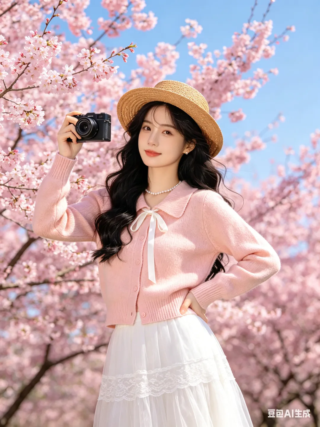 8K 高清,竖版人像写真,春日粉色杏花林,蓝天背景,清新治愈风格,一位女生,穿着粉色针织翻领开衫 + 白色蕾丝纱裙,头戴浅棕色草编礼帽,黑色长卷发,胸前白色丝带,佩戴珍珠项链,侧身站立,一只手叉腰,另一只手举着黑色相机,眼神看向镜头,背景是盛开的杏花,侧逆光勾勒发丝,画面清新自然,春日少女感。