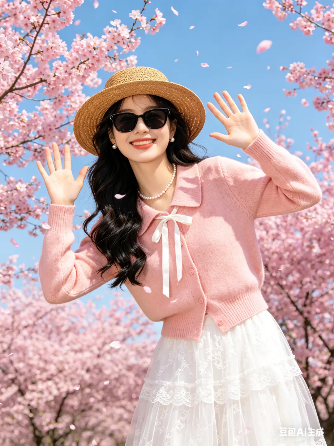 8K 高清,竖版人像写真,春日粉色杏花林,蓝天背景,清新治愈风格,一位女生,穿着粉色针织翻领开衫 + 白色蕾丝纱裙,头戴浅棕色草编礼帽 + 黑色墨镜,黑色长卷发,胸前白色丝带,佩戴珍珠项链,双手抬起在阳光下挥手,笑容灿烂,背景是蓝天和杏花,顺光拍摄,画面明亮活泼,春日元气少女感。