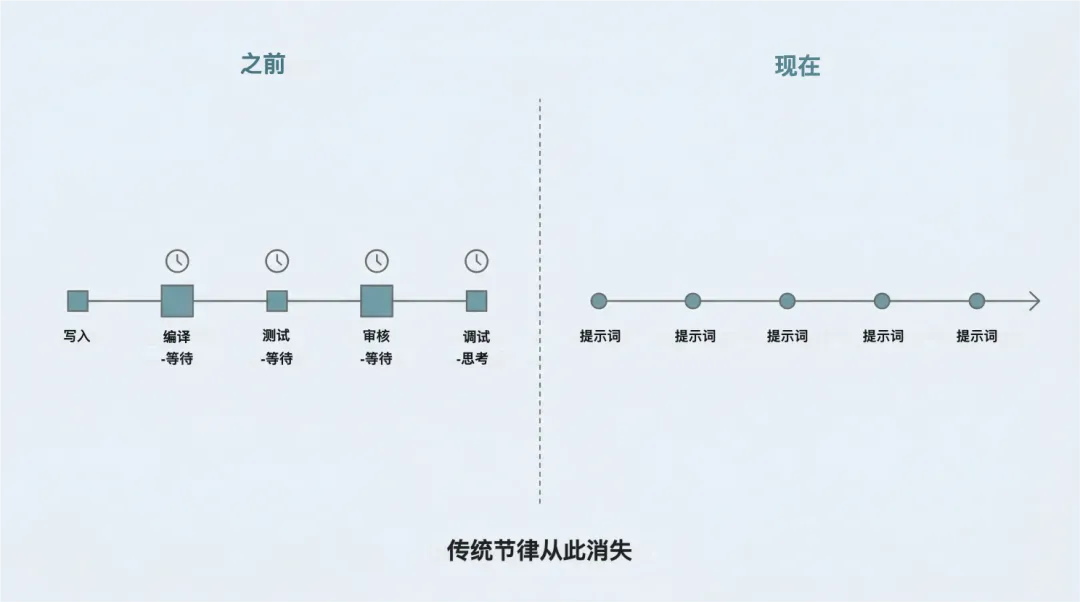 软件开发一直以来都有一种由自身阻力所决定的节奏。编译需要时间;测试套件运行需要几分钟;代码审查需要等待其他人阅读你写的代码并给出反馈;调试意味着要手动追踪逻辑,缓慢而持续地,这种专注力自然会耗尽。这些都是工作的脉搏,是嵌入其中的细微信号,表明某个部分已经完成,是时候评估、重新考虑或停止了。这种停顿就像节拍器一样。