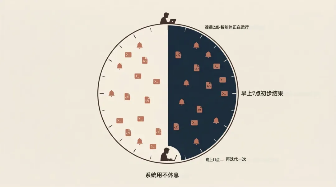 人工智能从内部瓦解了这条界限。智能体彻夜运行,拉取请求在你睡觉时不断累积。机器在你不在时仍在产出,这从根本上改变了你对休息成本的感知。离开工作不再像是一种恢复,而更像是一种浪费,因为在某个地方,某些东西正在被生产出来,而你却选择视而不见。这种压力很微妙,它既源于内疚,也源于雄心壮志:一种弥漫的内疚感,源于明明迭代随时可行却选择停止迭代,却无法判断这种选择究竟是出于自知之明还是疏忽大意。