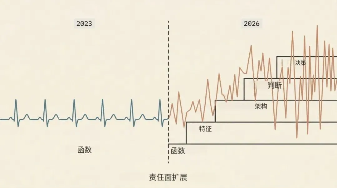 早期,当我把代码复制到GPT-3.5中再把结果粘贴回来时,我犯的错误主要集中在功能层面。比如模块之间的连接不牢固,依赖关系冲突等等。由于当时AI的输出范围很小,所以处理这些错误所需的内部知识量还算可以承受。但随着工具的改进和输出规模的扩大,我需要掌握的层面也随之提升。错误不再局限于功能层面,而是开始涉及特性、架构决策,甚至关乎我指导AI构建的系统是否真的合适。随着每一代工具的更新换代,责任范围不断扩大,而跟上这种变化所需的认知成本也随之同步增长。