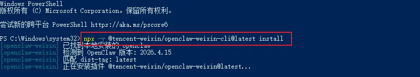 在确认环境都准备好了之后,接下来就是要在我的本地OpenClaw龙虾里,安装接入微信的消息通道插件,打开PowerShell工具,输入命令”npx -y @tencent-weixin/openclaw-weixin-cli@latest install“按回车后等待安装。
