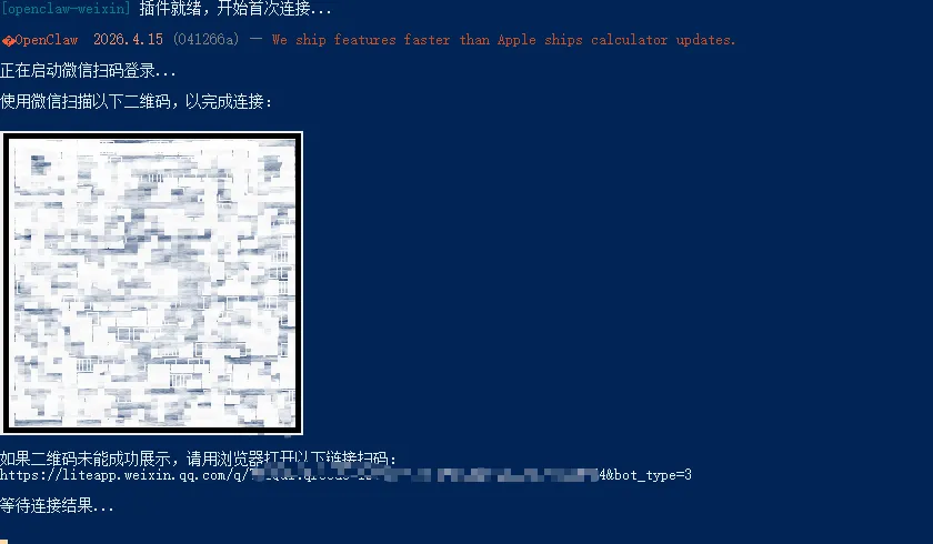 等插件安装完成后会出现与微信连接的二维码,这时我用需要接入OpenClaw的个人微信,打开”扫一扫”功能,扫描屏幕上出现的二维码后确认连接就行。