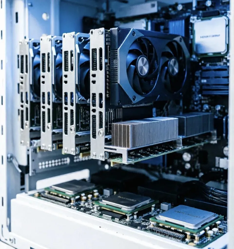GPU/NPU:最核心的算力单元,负责大规模并行计算。全球市场由NVIDIA主导,其Blackwell架构GB200系列单卡算力已突破3000TOPS;国产阵营中,寒武纪思元590、华为昇腾910C等芯片也正在加速追赶。