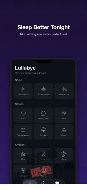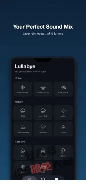 【Lullabye – Sleep Sounds】一款极简无干扰的助眠白噪音工具,让你自由叠加雨声、海浪、风声、篝火等舒缓音效,独立调节各音轨音量,设置渐弱睡眠定时,专注为你营造理想入眠环境。