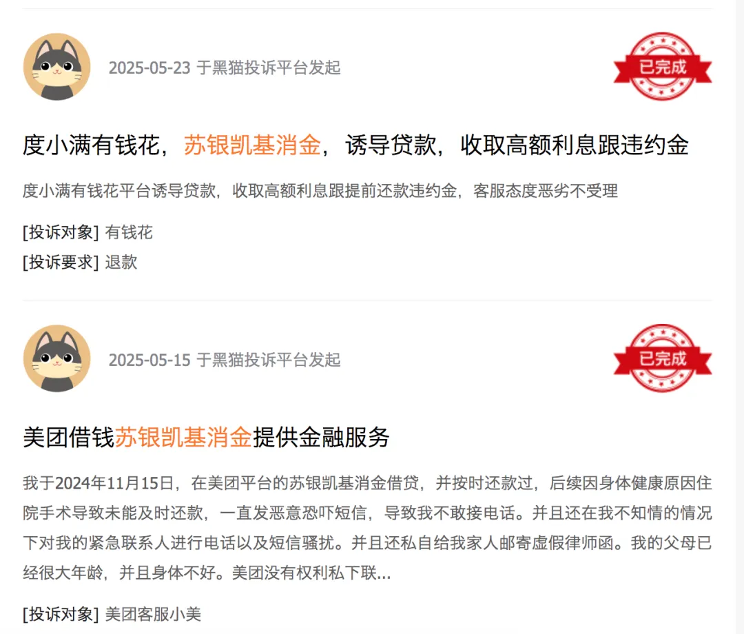 用户投诉层面的问题同样突出。黑猫投诉平台显示,苏银凯基消金多次被投诉“不当催收”“第三方骚扰”“违规扣款”,有用户反映,逾期后亲友频繁遭到催收电话骚扰,还有用户被擅自扣款11704.43元,利息及费用超出法定上限;更有在校学生投诉称,被诱导借款并收取高额担保费,陷入以贷养贷的循环。这些投诉直指其在贷后管理、用户权益保护方面的失控。