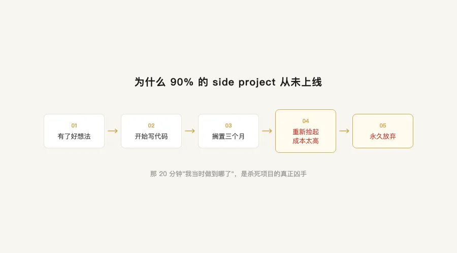 不是因为你不够聪明,也不是因为想法不够好。大多数项目死亡的原因,是重新捡起来的成本太高。