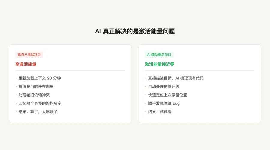 激活能量。重新捡起一个搁置项目的心理成本,从”算了,太麻烦了”变成了”试试看”。这一点是真实的,不是炒作。