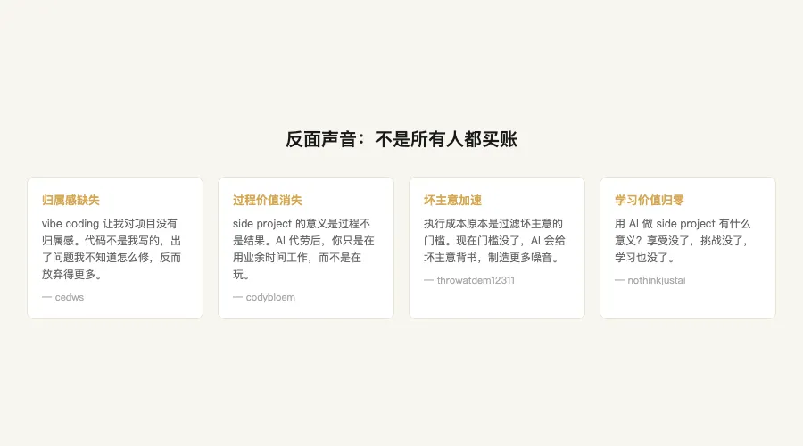 codybloem 的观点更尖锐:side project 的意义是过程,不是结果。你享受的是解决问题的过程,是学到新东西的感觉。AI 代劳之后,你只是在用业余时间工作,而不是在玩。