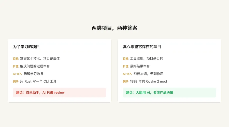 所以问题不是”AI 适不适合做 side project”,而是”你做这个项目是为了什么”。
