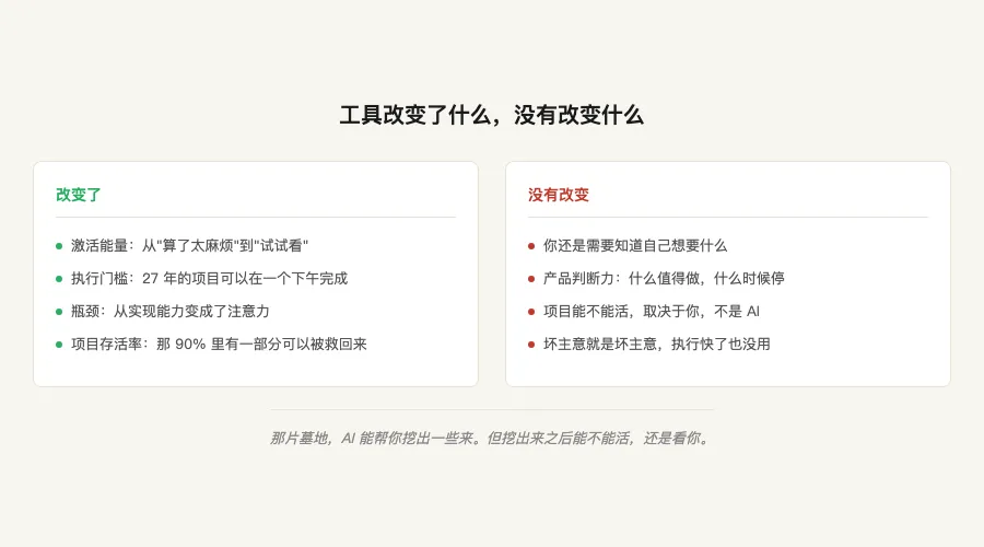 那片项目墓地,AI 确实能帮你挖出一些来。但挖出来之后能不能活,还是看你。