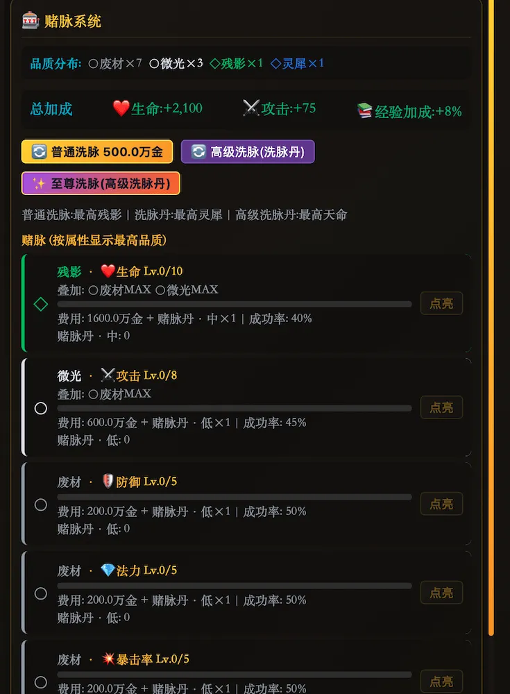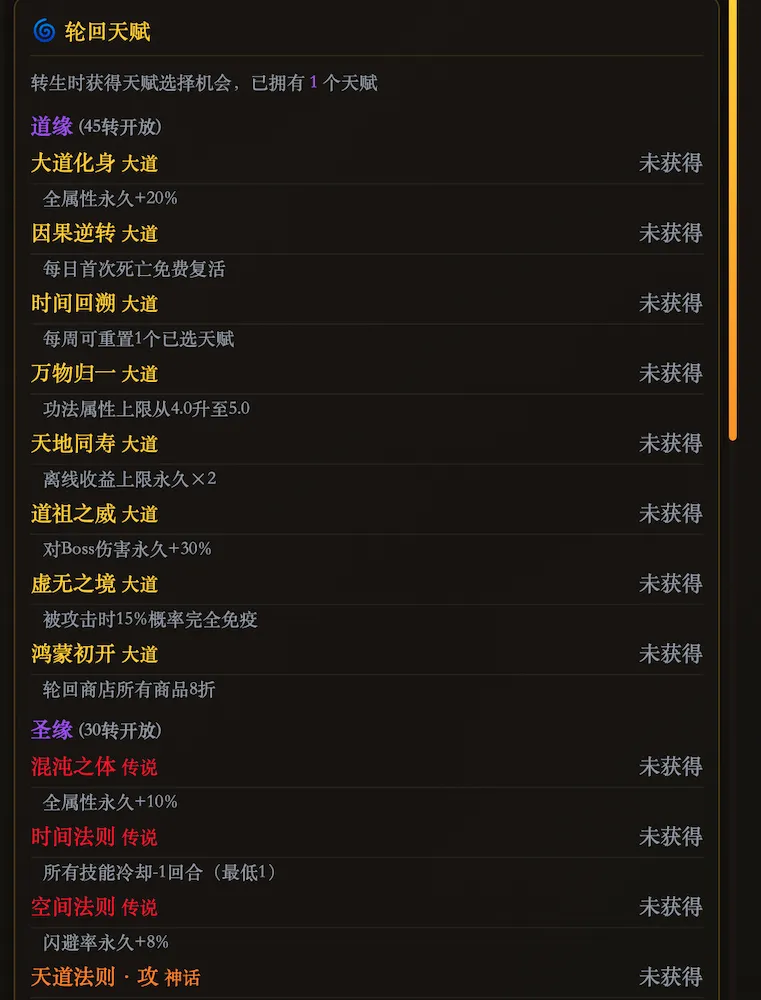 等级达到上限后击败转生Boss,开启下一世修行。每次转生永久提升攻防血蓝,并从44个天赋中随机抽取。天赋分4层品质,从凡缘到道缘层层递进——”灵气亲和”经验+8%、”剑意通明”攻击+8%+技能伤害+5%、”大道化身”全属性+20%……每次转生都是全新的策略组合。