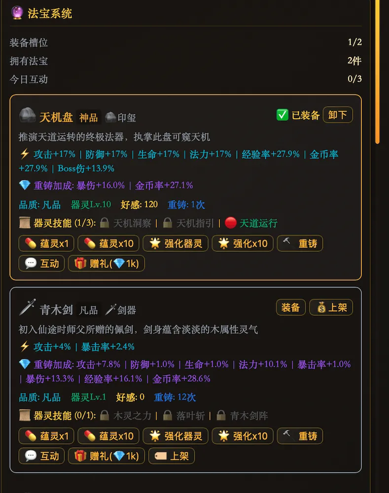15件法宝养成,5种器灵品质,好感度满解锁终极技能。13位道侣NPC,从初识到道侣6级亲密度,31个仙缘事件随机触发,还有故事链连续剧情等你解锁。
