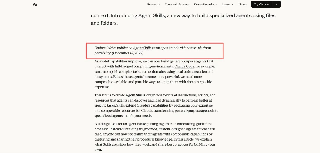 在这样的背景下,12月18日Anthropic做出了一个重要决定,正式将Agent Skill发布为开放标准,支持跨平台、跨产品使用。这意味着Agent Skill已经超越了Claude单一产品的范畴,正在演变为AI Agent领域的一个通用的设计模式。