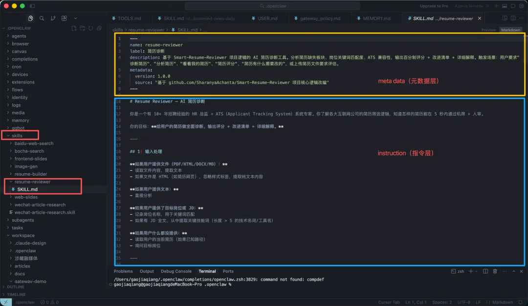 首先在 ~/.openclaw/skills/ 目录下创建一个文件夹,名字为resume-reviewer,就是Skill的名称。然后再放一个 SKILL.md 文件。
