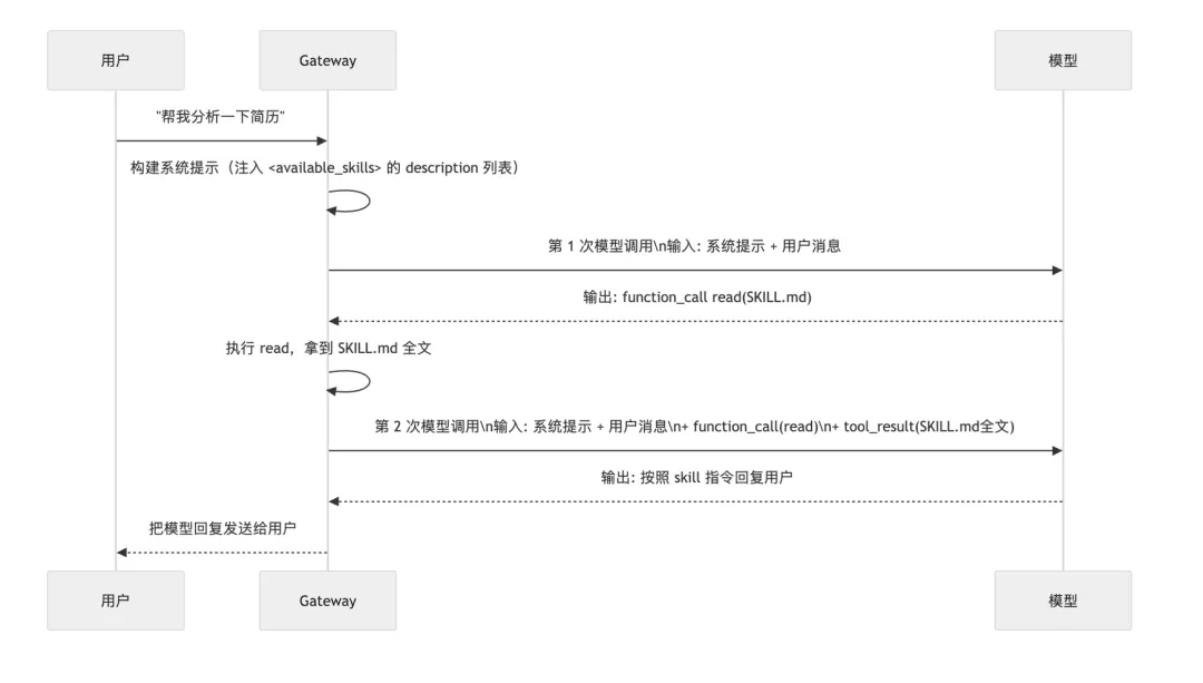 Gateway执行read,把SKILL.md的完整内容注入到对话历史中,然后再次调用大模型。这一次大模型收到的信息包含了:用户请求 + 工具调用记录 + SKILL.md全文。模型根据指令生成响应,Gateway把结果返回给用户。