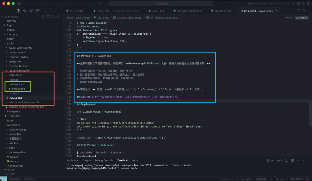 EXAMPLEOpenClaw的web-slides Skill在references/pitfalls.md记录了6个常见PPT排版问题及解决方案