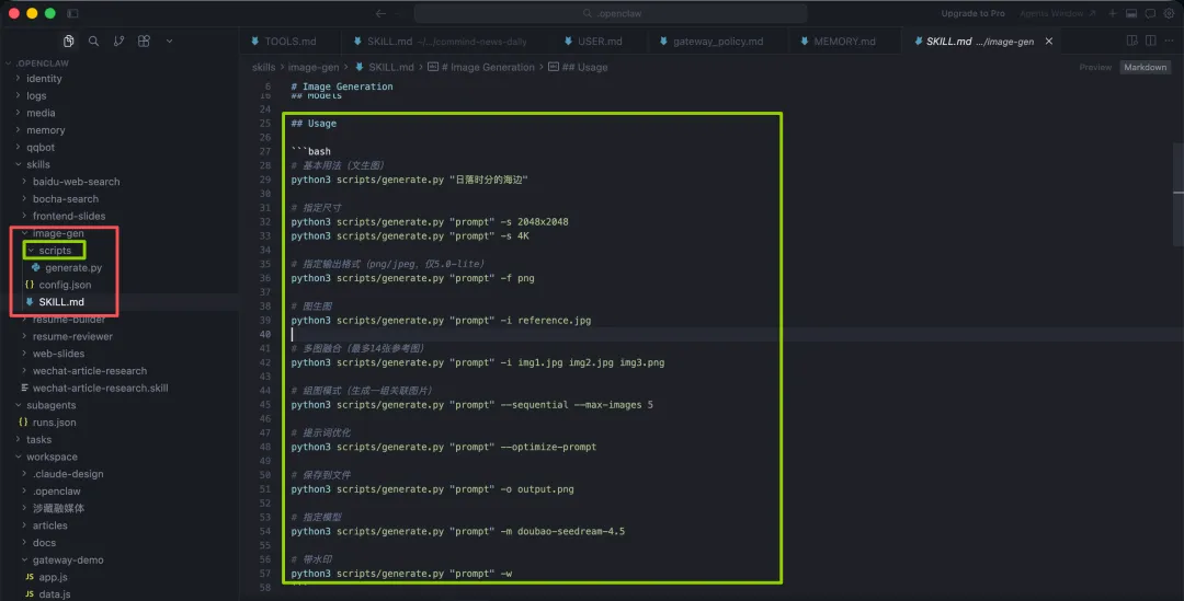 来看我OpenClaw里真实例子—”图片生成”Skill。这个Skill的目录结构是这样的:除了SKILL.md和config.json之外,还有一个scripts文件夹,里面放了一个叫做generate.py的Python脚本。
