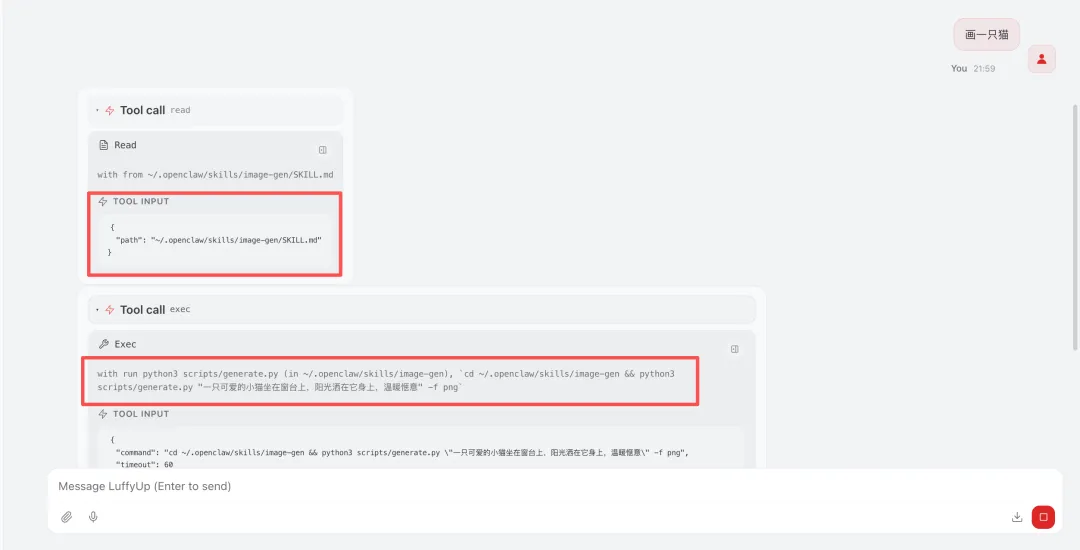 当用户说”画一只猫”时,大模型识别这个请求跟”图片生成”Skill相关,输出read工具调用去读取SKILL.md。读完SKILL.md后,大模型知道了该怎么生成图片,于是又输出了一个exec工具调用去执行generate.py脚本。
