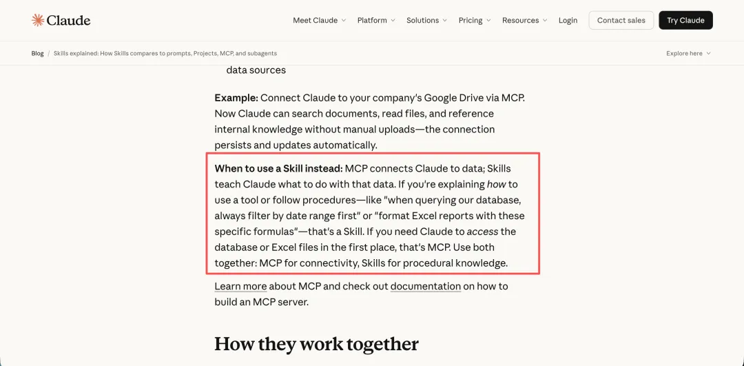 “MCP connects Claude to data;skills teach Claude what to do with that data.”