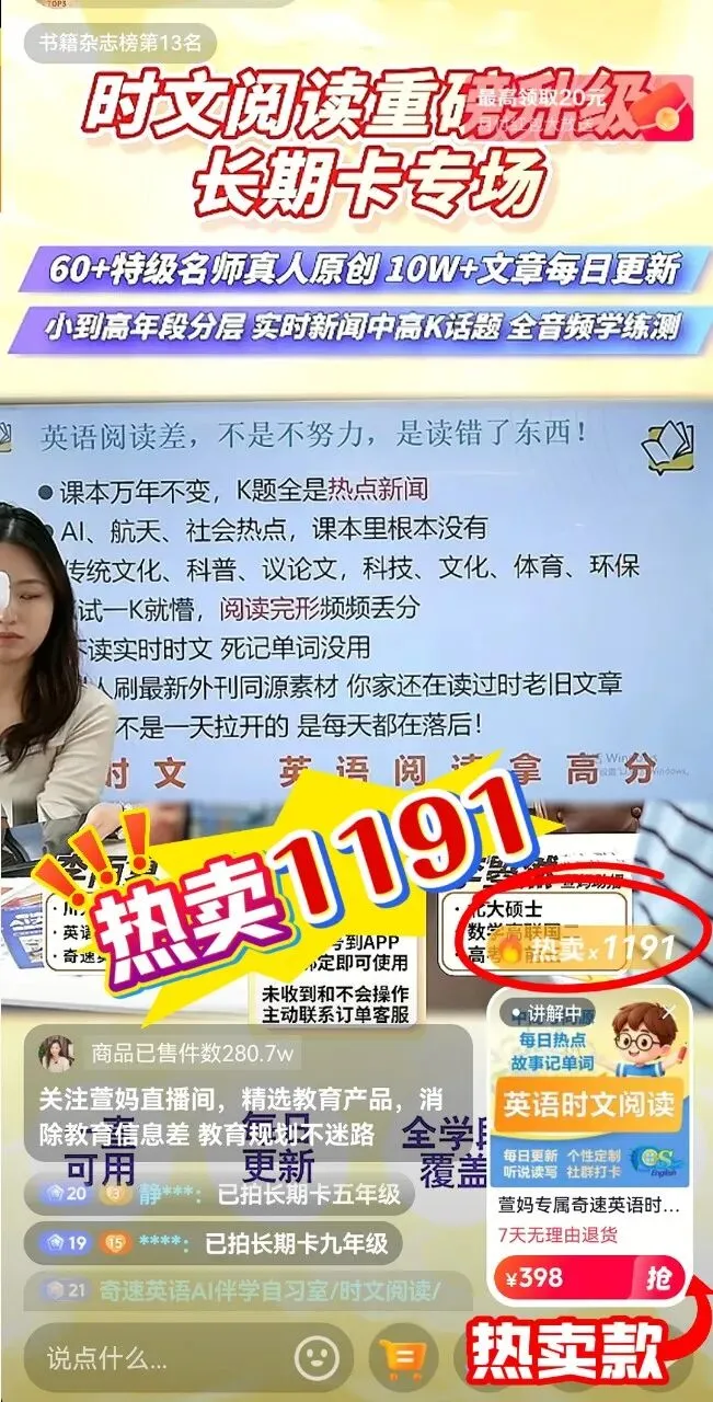 纸质教辅+线上系统双向结合,同步课标考点,搭配直播精讲,是机构、校内合作刚需品类。产品质量过硬,一场直播成交1200单。